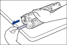 Если потянуть упаковочную ленту с чрезмерной силой или вытащить ее не полностью, тонер может просыпаться с ленты. При попадании тонера в глаза или рот немедленно смойте тонер холодной водой и обратитесь к врачу.