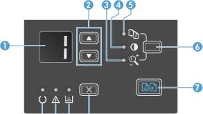 6 Выбор параметров копирования: число копий, затемнение и размер копирования для каждого задания. Параметр по умолчанию - число копий. Чтобы изменить параметр по умолчанию для всех заданий, выберите параметр, затем нажмите и удерживайте клавишу 3 секунды. Измените параметр, когда индикатор начнет мигать. Еще раз нажмите клавишу, чтобы сохранить параметр.