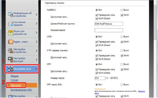 Установите для параметра "SMTP (передача эл. почты)" значение [Вкл.] в разделе "Протоколы отправки".