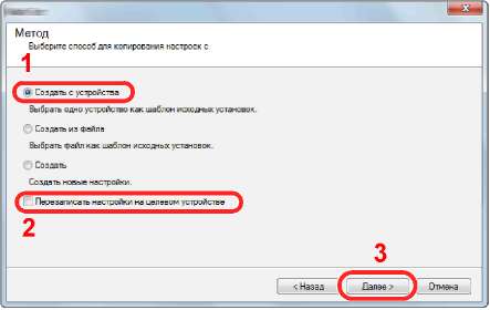 5 Выберите [Создать с устройства] и снимите флажок с опции [Перезаписать установки целевого устройства], затем нажмите [Далее].