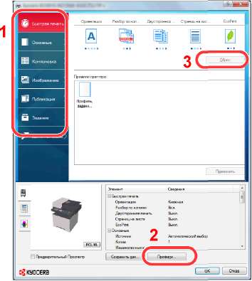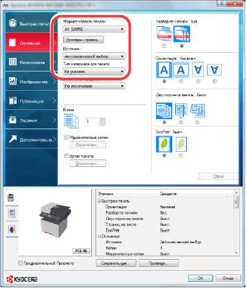 Содержит значки, которые можно использовать для простой настройки наиболее используемых функций принтером и мфу киосера. При любом нажатии на значок меняется изображение, напоминающее результаты печати, и применяются настройки.