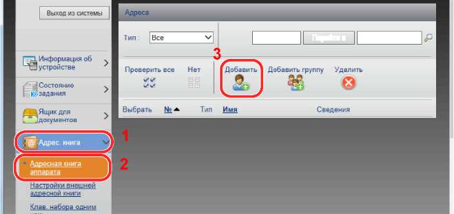 4 Из меню [Адрес, книга] выберите [Адресная книга аппарата].