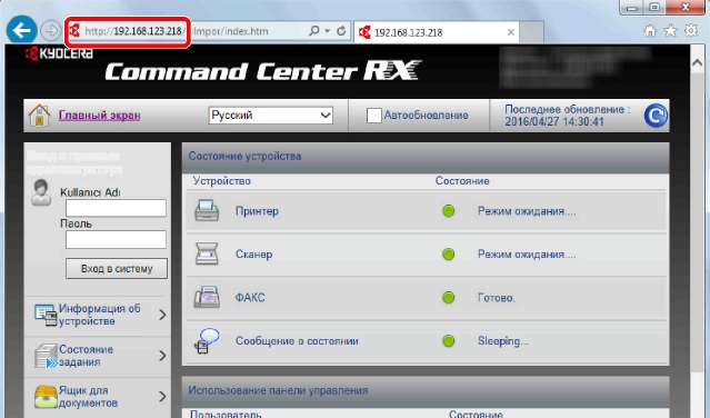 На веб-странице отображается основная информация об аппарате и Command Center RX, а также их текущее состояние.
