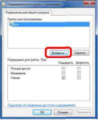Выбор пункта "Все" предоставляет разрешение на общий доступ каждому пользователю в сети. Для усиления безопасности рекомендуется выбрать "Все" и снять флажок [Разрешить] для разрешения "Чтение".