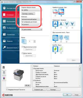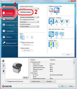 На этой вкладке сгруппированы основные часто используемые функции. Ее можно использовать для настройки формата бумаги и двусторонней печати.