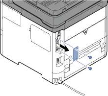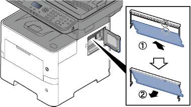 Чтобы удалить модуль памяти, снимите с аппарата правую крышку и крышку гнезда модуля памяти. Затем осторожно вытолкните два зажима гнезда. Освободите модуль памяти и извлеките его из гнезда.