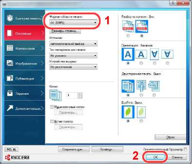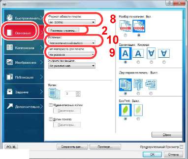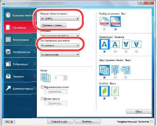 В этой вкладке сгруппированы основные часто используемые функции. Вы можете использовать ее для конфигурации формата бумаги, пункта назначения и двусторонней печати.