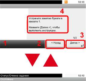 В случае замятия бумаги печать прекращается, и на сенсорной панели отображается следующее сообщение с указанием места замятия.