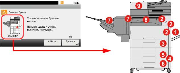 При замятии бумаги на сенсорной панели отображается место замятия бумаги, а также инструкции по устранению проблемы.