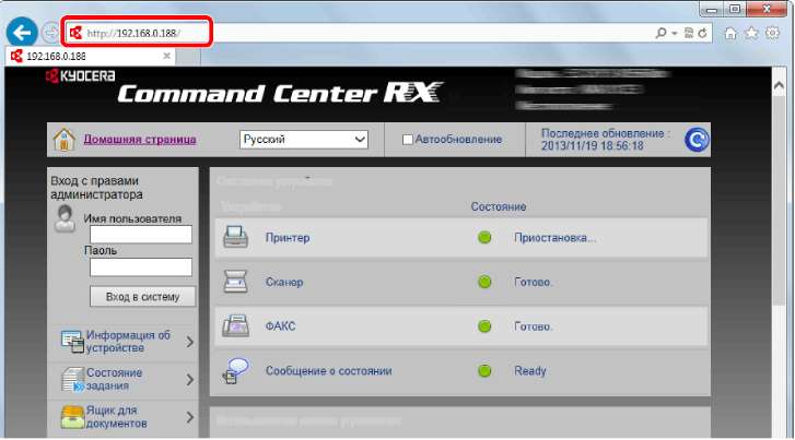 Если появляется экран аутентификации пользователя, следует ввести имя пользователя и пароль для входа в систему, а затем нажать [Вход]. Для этого вам нужно осуществить вход с правами администратора.