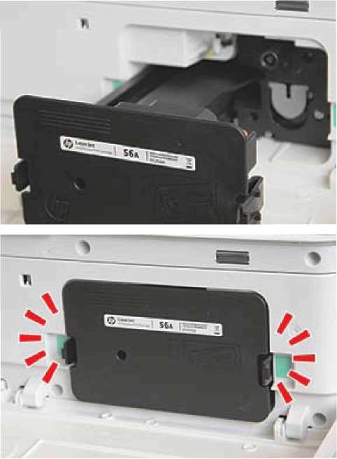 4. Совместите тонер-картридж с отверстием и нажмите до фиксации. Картридж фиксируется на месте со щелчком.
