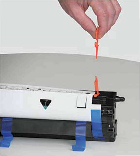 3. Снимите оранжевые фиксаторы с узла формирования изображения.