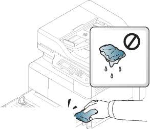• Внутреннюю область устройства очищайте безворсовой тканью, будьте осторожны, чтобы не намочить ролик передачи или другие внутренние компоненты. Не используйте растворители, такие как бензол. Могут возникать проблемы качества печати, а также повреждение устройства.