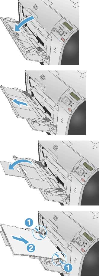 Полностью раздвиньте направляющие бумаги (1) и заправьте стопку бумаги в лоток 1 (2). Отрегулируйте направляющие по ширине бумаги.