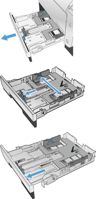 3. Чтобы загрузить бумагу формата Legal, необходимо увеличить размеры лотка. Для этого прижмите фиксатор и вытяните переднюю часть лотка к себе.