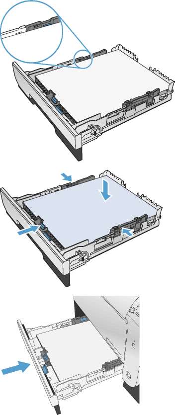 Поместите бумагу в лоток и убедитесь, что она лежит ровно всеми четырьмя углами. Сдвиньте боковые направляющие для бумаги по меткам размера внизу лотка. Сдвиньте переднюю направляющую, чтобы она прижимала стопку бумаги к задней стенке лотка.