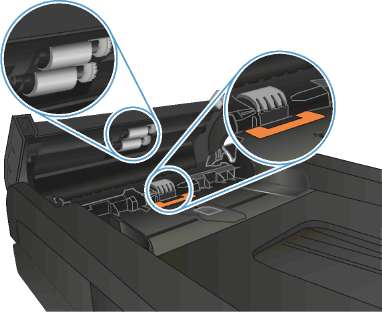 • Очистите подающие ролики и подающую пластину устройства подачи документов. Воспользуйтесь сжатым воздухом или неволокнистой тканью, смоченной теплой водой Если это не помогло, замените ролики.