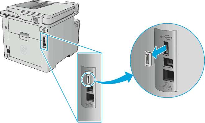 • К USB-хоста, который расположен на задней панели, необходимо подключить флэш-накопитель (USB 2.0) с минимум 16 ГБ свободной памяти. На этом USB-накопителе хранится сохраненные задания, отправленные на принтер. При отсоединении этого USB-накопитель от принтера функция хранения заданий выключается.