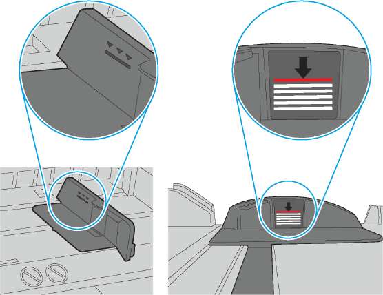 Следующие изображения показывают примеры указателей высоты стопки бумаги в лотках различных принтеров. Большинство принтеров HP имеют указатели, похожие на эти. Также убедитесь, что все листы бумаги находятся под выступами возле указателя высоты стопки. Эти выступы помогают удерживать бумагу в правильном положении при прохождении в принтер.