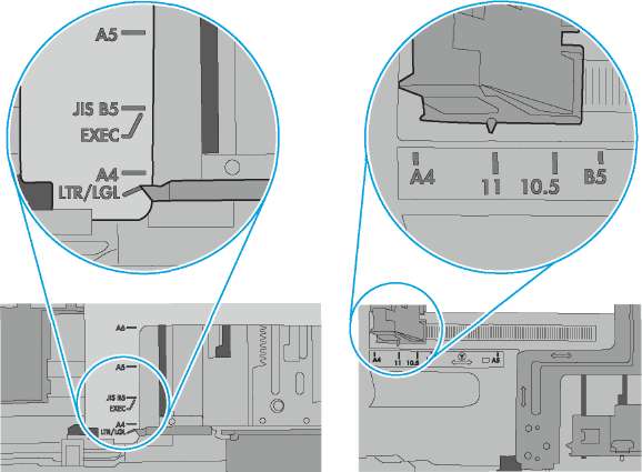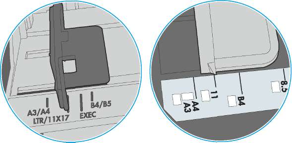 На следующих изображениях показаны примеры указателей формата бумаги в лотках для различных принтеров. Большинство принтеров HP имеют указатели, похожие на эти.