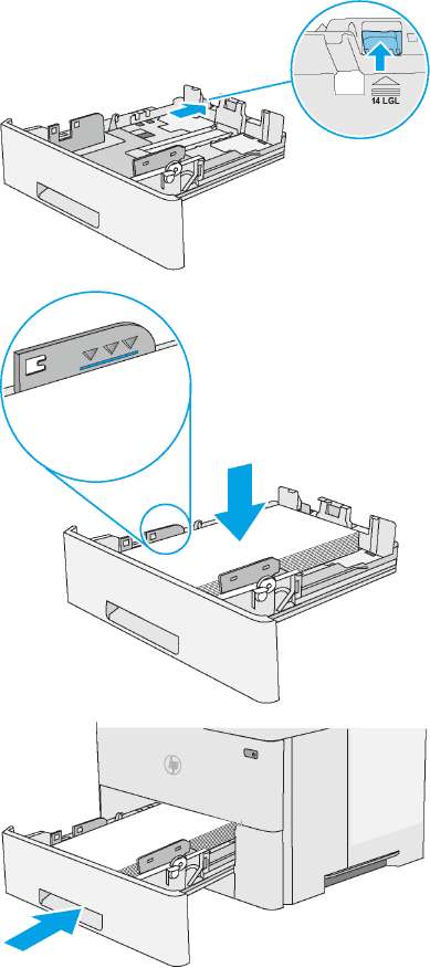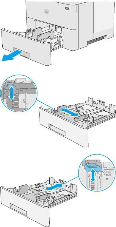 4. Чтобы загрузить бумагу формата Legal в лоток, сожмите рычаг на задней стороне лотка, который находится слева от центра, затем задвиньте лоток обратно по формату бумаги.