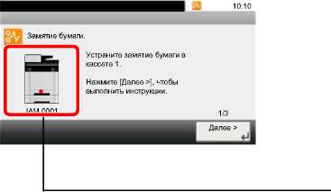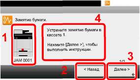 При замятии бумаги на сенсорной панели отображается место замятия бумаги, а также инструкции по устранению проблемы.