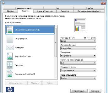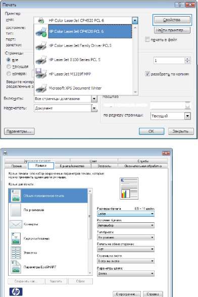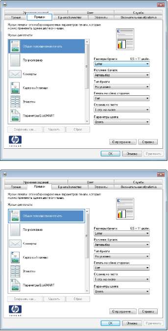 При выборе ярлыка меняются соответствующие параметры в других вкладках драйвера печати.
