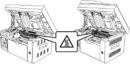 Некоторые детали принтера остывают не сразу после использования. Открывая переднюю или заднюю крышку для очистки внутренностей принтера, не касайтесь деталей, которые заштрихованы на рисунке, чтобы не обжечься.