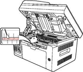 8. Очистите принтер изнутри с помощью сухой ткани, не оставляющей ворса, осторожно протерев затемненную область на рисунке ниже.