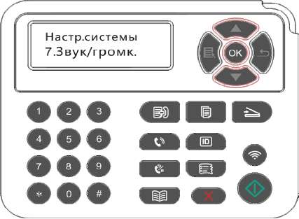 3) С помощью кнопок со стрелками вариант "вверх" или "вниз" выберите пункт "Звук/громк.", нажмите кнопку "OK", настроить "указатнльный сигнал", "вызов по звонку", "тональный сигнал факса", "общий объем звука".