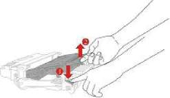 3. Hажми синую кнопку в левой стороне блок барабана левой рукой, в это же время подхвати ручку картриджи правой рукой, вынимайте tuj.