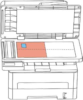Верхняя или нижняя страница или левая и правая половина страницы А5: помещать на стекло экспонирования "синяя область".