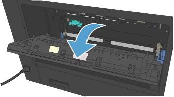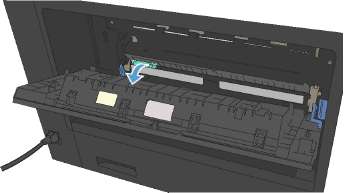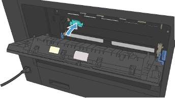 2. Нажмите зеленый ограничитель, чтобы открыть крышку доступа к замятиям термофиксатора.