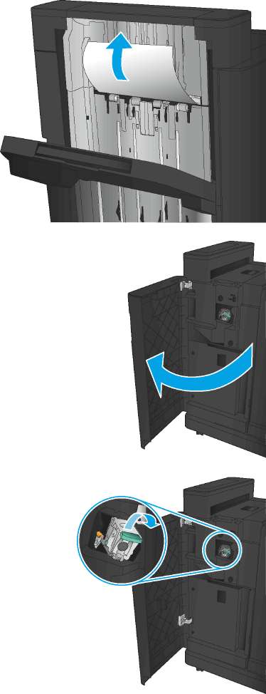 7. Нажмите на пластину устранения затора в нижней части картриджа брошюровки внакидку, нажмите на пластину в передней части картриджа и уберите все скрепки.