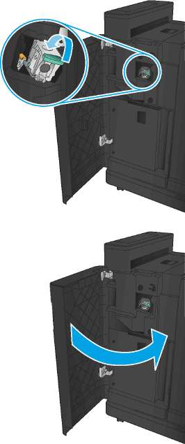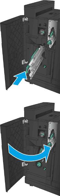 10. Потяните на себя ручку модуля картриджей сшивателя, а затем поверните ее вниз, пока модуль не встанет в исходное положение. Зафиксируйте его в этом положении, толкая ручку внутрь.