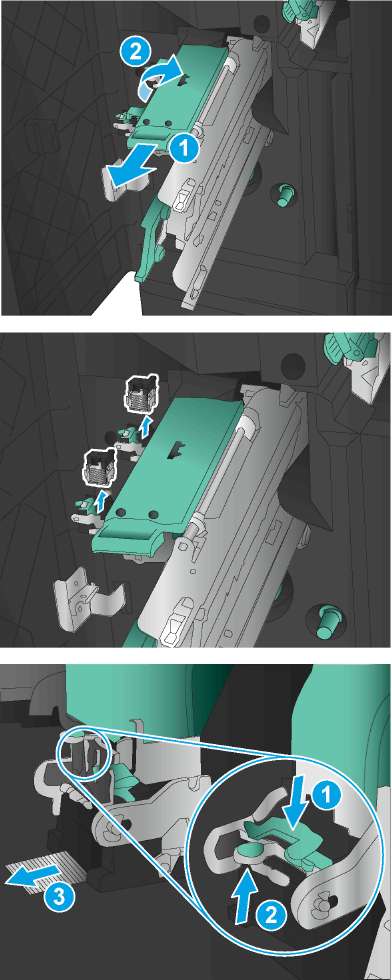 б. Возьмитесь за края каждого картриджа сшивателя и его потяните, чтобы извлечь картриджи сшивателя из модуля.