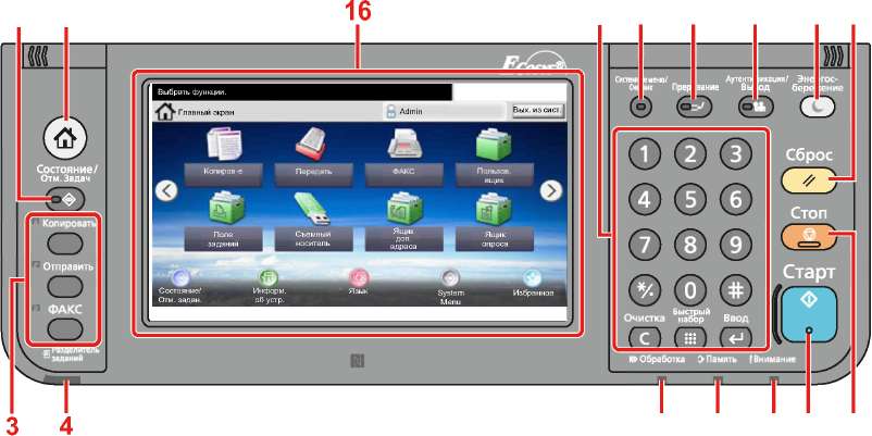 11 Клавиша [Энергосбережение]: перевод аппарата в режим ожидания. Выход из режима ожидания, если аппарат находится в нем.