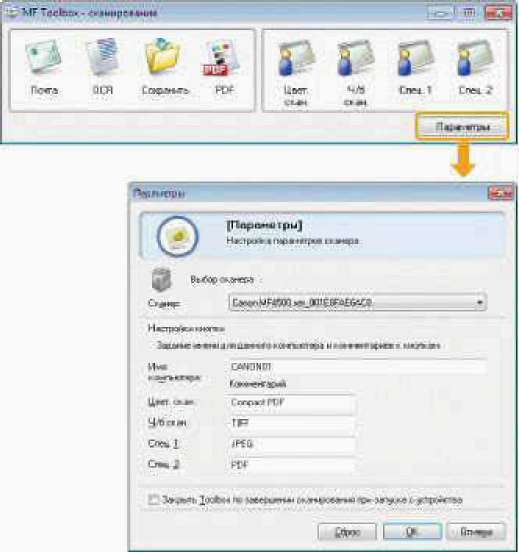 Если этот флажок установлен, экран программы MF Toolbox будет закрыт после завершения сканирования с помощью клавиш на панели управления.