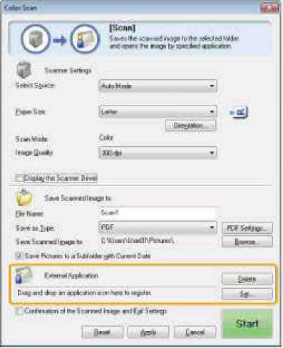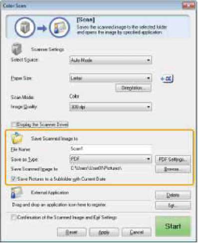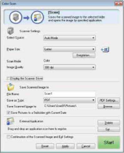 При нажатии кнопки [Start] (Пуск) появляется диалоговое окно [ScanGear MF], в котором указать дополнительные настройки для сканирования.