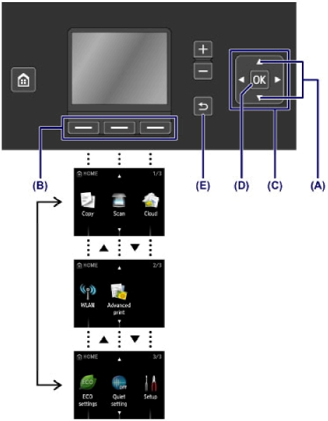 Экран НАЧАЛО (HOME) разделен на три части. Кнопками (A) можно переходить между экранами. На каждом экране содержатся меню для создания копий, сканирования оригиналов и т. д.