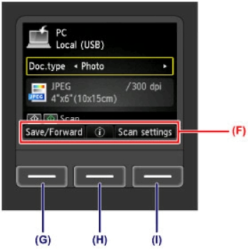 Если выбрать меню на экране НАЧАЛО (HOME), в определенном месте нижней части экрана отобразится меню функций (F). Нажмите соответствующую кнопку Функция (Function) (G), (H) или (I), чтобы отобразить ее функцию, например экран параметров.