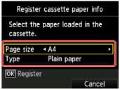 После установки кассеты на ЖК-дисплее отобразится экран для ввода параметров бумаги. Выберите A4 или Letter для параметра Разм. с. (Page size) и Обычная бумага (Plain paper) для параметра Тип (Type), затем нажмите кнопку OK.