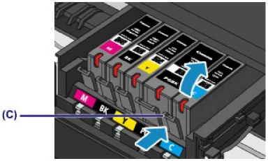 4. Снимите тот, индикатор которого часто мигает. Надавите на язычок (C) и извлеките его.