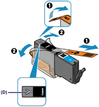• Если оранжевая лента останется на вентиляционном отверстии Y-образной формы (D), чернила могут разбрызгаться или устройство может выполнять печать неправильно.