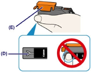 2. Возьмите чернильный контейнер так, чтобы оранжевый защитный колпачок (E) был направлен вверх, и не блокируйте вентиляционное отверстие Y-образной формы (D).