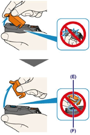 • Не касайтесь внутренней стороны оранжевого защитного колпачка (E) или открытого отверстия для чернил (F). Если до них дотронуться, можно испачкать руки.