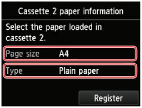 После установки кассеты в устройство на сенсорном экране отобразится экран регистрации информации о бумаге. Выберите для параметра Разм. с. (Page size) значение A4 или Letter, а для параметра Тип (Type) — значение Обычная бумага (Plain paper), затем легко коснитесь кнопки Зарегистрир. (Register).