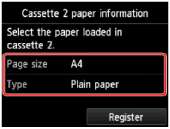После установки кассеты в устройство на сенсорном экране отобразится экран регистрации информации о бумаге. Выберите для параметра Разм. с. (Page size) значение A4 или Letter, а для параметра Тип (Type) — значение Обычная бумага (Plain paper), затем легко коснитесь кнопки Зарегистрир. (Register).