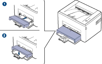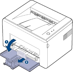 1. Возьмитесь за лоток подачи бумаги и потяните его на себя. Надавите на заднюю направляющую и вытяните ее, чтобы увеличить глубину лотка.