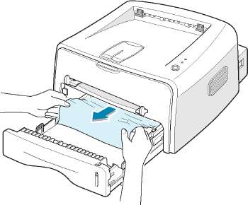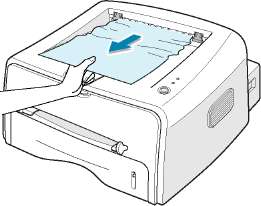 1 Если замятие бумаги произошло при выходе бумаги в выводной лоток, и значительная часть листа видна, вытащите бумагу, потянув ее прямо вперед.